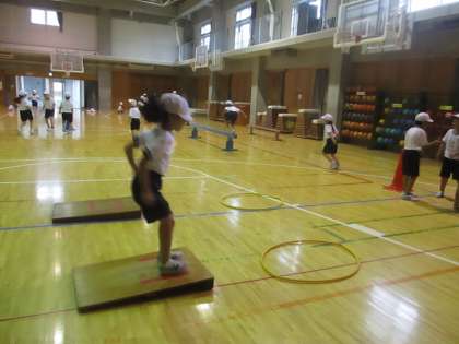 今日は、用具を使った運動遊びをしました。じゃんけんで勝ったら1コース進むというゲーム感覚で楽しく活動しました。みんな汗いっぱいです。