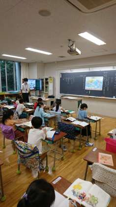 1年生の教室に行くと黒板には世界地図が。何の授業でしょうか。見てみると、国語の授業でした。「大きなかぶ」の学習に入ったんですね。ロシアの民話なので、まずはロシアという国を確認したようです。