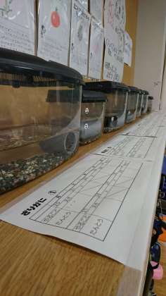 2年生の教室の後ろに、水槽が8つ並んでいます。中を見ると、ザリガニがいました。ザリガニのお家になるトンネルもそれぞれにあり、快適な空間になっています。逆さまになってご機嫌(?)です。班ごとにお世話をしているんですね。えさとそうじの担当チェック表も付いています。
