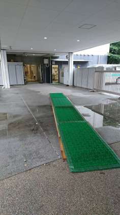 さて、今日は雨が強くなりました。ブリッジ下に水が溜まりやすく、雨が降ると小アリーナに移動する子供たちの行く手を阻むことがあります。止んでいれば水を掻き出しますが、今日は雨が降り続いていたので、主事さんが橋を架けてくれました。マットの下に木材で頑丈な橋が隠されています。小アリーナに行くことが多いきはだ学級の子供たちも安心です。