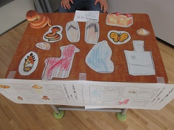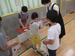 「からすのパンやさん」の学習から、自分たちでオリジナルのパンとおすすめポイントをを考えてきました。今日はお客さんである他のグループの友達に、おすすめポイントを伝えながら楽しいお買い物体験ができました。「○○ベーカリー」と、それぞれがお店に名前を付けて、自分だけのオリジナルパンを売る活動は楽しく、また売り切れた様子を見てニッコリと嬉しそうな顔が見れました。お客さん側も、「げたパン」「シャークパン」「ダンスパン」など個性豊かなオリジナルパンに興味津々。最後の振り返りでは、「楽しかった」というお客さんの声や、「売り切れて嬉しかった」というお店側の声まで、どちらにもwin-winな活動となりました。