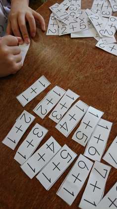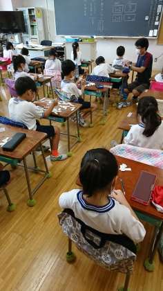 1年生は、算数でたし算の計算カードを作っていました。一桁の答えになるたし算が書かれたカードを切って、裏にはその答えを書いていきます。これで繰り返し練習ができますね。全部できた人は間違っていないか確認をして、さっそく練習していました。