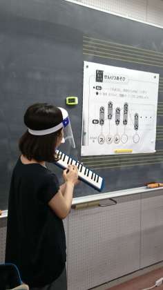 教員は、フェイスガードを着用してお手本の演奏です。