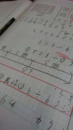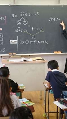 これまでのわり算は、九九を使って解くことができましたが・・・。これまでに習った方法を使って解けないか、方法をよく考えていました。 その中で、わられる数の69を位ごとに分けて計算する方法が出てきました。69を6と9に分けます。おお、ここでもさくらんぼが使われていますね。