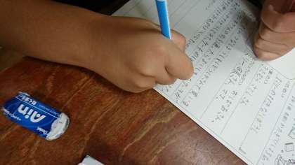 登場人物やあらすじを書き、初めに「読みたい!と思わせるにはここが大事ですよ。」と言われた、最も大切な「おすすめポイント」に取りかかります。時折、教科書を読み返しながら、人物や内容を振り返って書いていました。