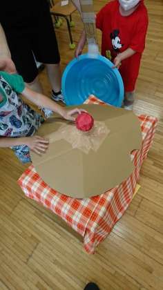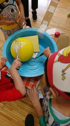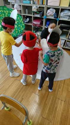 1年生は3人で、国語で学習した「ぐりとぐら」の発表をします。大きなフライパンや卵を使って劇をしながら、繰り返し読んで覚えたお話をすらすら話していきます。本番が楽しみです。