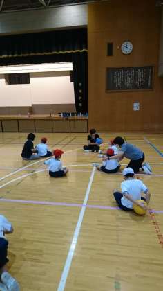 低学年グループは、ボール運動です。ボールを落とさないように、体の回りを回すのが難しそうでしたが、ゆっくり確かめながら練習していました。