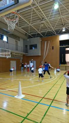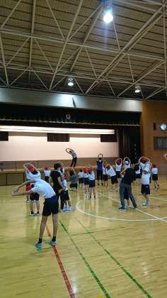 中・高学年グループは、体を大きく使った運動です。ケンケンパの要領でジャンプしながら前に進む運動をしていました。