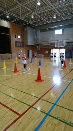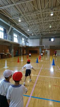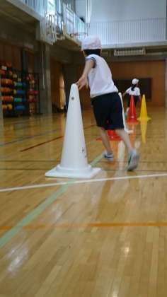 置かれたコーンを右へ左へ、くねくね進んでいます。先日は、校庭にくねくねの線を引いて、その上を走っていました。今日は1つレベルアップでしょうか。上手な子は、体を曲がる方に傾けながら進んでいきます。それをお手本にみんなうまく進んでいくようになりました。