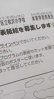 終わった子で、現在募集中の体育学習発表会のプログラムの表紙の絵を描いている子がいました。各クラスでも募集の紙が配られます。4日(金)までです。ぜひたくさん応募してください。