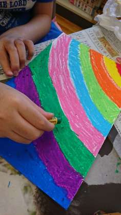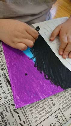 クレヨンで色とりどりの色で塗った画用紙を、黒で塗りつぶしていきます。