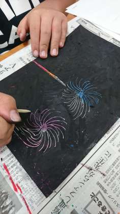 なんてことはありません。塗りつぶした黒を、先の尖った割り箸で削っていくと、夜空に上がる花火が現れました!