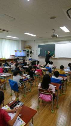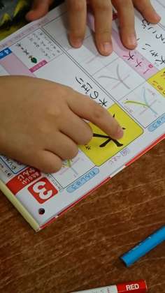 平仮名や片仮名の学習と同じように、形や読み方、言葉を確認しながら、丁寧に練習していました。ちょうど漢字ドリルの手本の文字を指でなぞり書きしているところでした。「やめ」の声がかかるまで、繰り返し練習をしています。繰り返しなぞったり、空書きをしたりするのは、文字を覚えていくのに有効です。がんばって続けていきましょう。