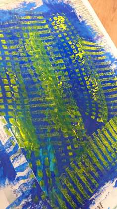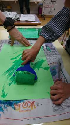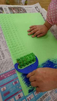 好きな色を選んで、スポンジローラーを思いのままに走らせます。スポンジローラーは、様々な形状があって、使うローラーによって、現れる模様も変わります。自分が思った通りの模様になったり、ならなかったり、重なって予想もしないような模様が浮かび上がったり・・・でも全部きれいで、できあがった作品にみんな満足そうな表情をしていました。