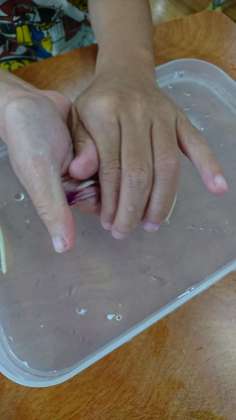 育てたあさがおの花を冷凍で保存しておき、水に浸けて色を出していきます。何色になるだろう、と楽しみにもみもみしていると、段々と色が出てきました。