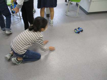 今日は電池のはたらきの学習が終わり、待ちに待ったおもちゃづくり!モーターを使って車を走らせます。子供たちは早く走らせたくて,真剣に設計図を見て作り始めました。完成後、さっそく廊下などを使って実験!歓声が上がりました。