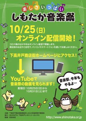 例年、秋の下高井戸の町を熱く盛り上げてくれる「しもたか音楽祭」ですが、今年度は、新型コロナウイルス感染拡大防止のため、YouTubeチャンネルを利用してデジタル配信されています。