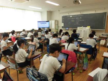 本日は、総合の時間に、e-ラーニング(ドリルパーク)を活用した学習支援の導入に向けて、タブレットでログインの仕方を学習しました。