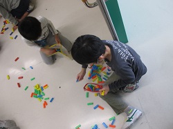 次は、ゲームクラブ!今日はブロック遊びをしました。細長いブロックを思いのままに並べたり、積み上げたりと、一人一人自分なりの楽しみ方をしていました。