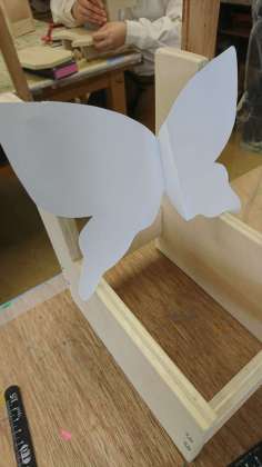 6年生が図工で作っている椅子の作業も、いよいよそれぞれの個性が出る背もたれと座面の制作に入っていました。
