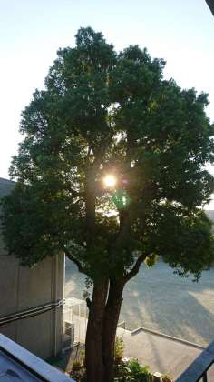 校内を歩いていると、時々美しい光景に出会い足を止めることがあります。今日は3階で、くすのきと太陽のすてきなコラボレーションに出会いました。タイトルは、「くすのきの生命」。今日も、いい天気!元気が湧いてきます。