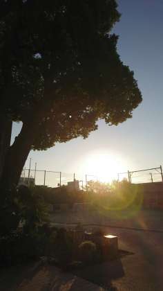 おはようございます。今日は、朝学校に着くと、ちょうど太陽が昇ってきて、学校が明るい光に包まれて目を覚ますところでした。