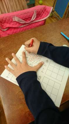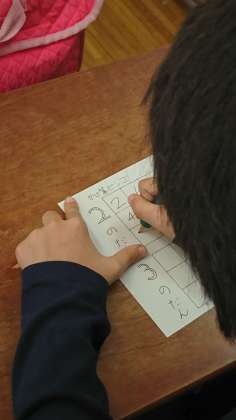 今日は、やり方を説明して、2の段をやってみました。3×3の9マスに2の段の九九の答えを書き、引いたカードの九九を全員で言ってから丸をします。横・縦・斜めに3つ揃えば