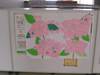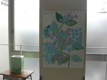 現在、廊下にはとびらいっぱいのあじさいが咲いています。