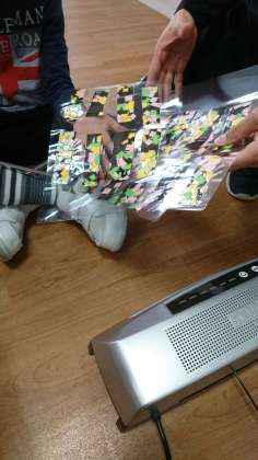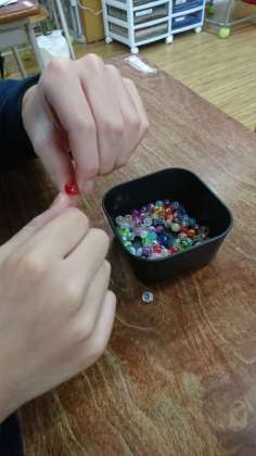 今日は、お店の準備をしているところでした。ビーズを使ったアクセサリーを作ったり、ラミレーターを使って、下敷きやしおりを作っていました。中には、最新機種のスマートフォンを作っている子も!リンゴのマークの付いた「12」です。カメラが本物そっくり!
