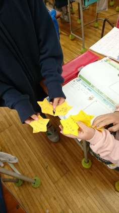 今日は、「いいところ みいつけた」というお話で、「自分の良いところ」について考える内容でした。最後に、自分について考えるところでは、友達が書いてくれた自分の「良いところ」を読み、改めて「自分の良さ」について考えていきました。