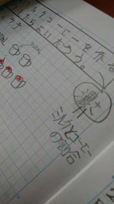 6年生は、おいしいミルクコーヒーを作る学習、ではなかった、算数で「割合」の学習をしていました。