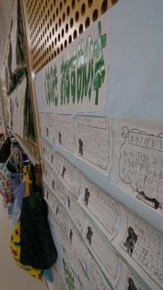 教室の廊下には、みんなのおすすめの本が掲示されています。友達がすすめる本、ぜひ読んでみたくなります。