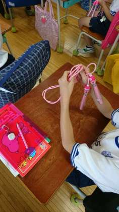 1年生が、体育に行く前に教室で短縄の結び方や持ち方の練習をしていました。