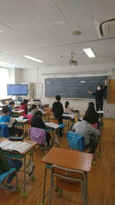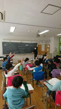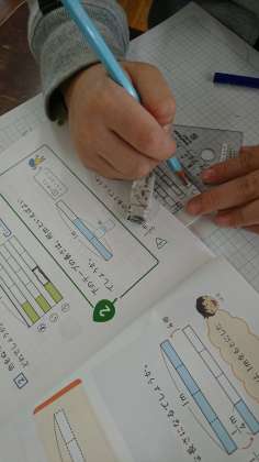分数自体は、2年生でも少しだけ学習をしているので、2度目の分数の学習です。今日は、テープ図に表された分数のうち、どれが1/5mか答えて、そのわけを説明する問題に取り組んでいるところでした。「わけを説明する」というのは、なかなか難しいものですが、うまく言葉を使って説明していました。