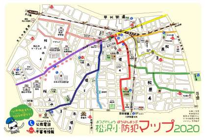 今回配付されたクリアファイルは、そんな状況で、集合等も難しい中でしたが、「子供たちの安全・安心のため」と、アンケートを実施して『松沢小防犯マップ2020』を作成し、クリアファイルにしてお届けいただいたものです。ぜひ、ご家庭でお子さまと一緒にご確認いただき、地域の防犯について考える機会にしてください。