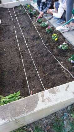 栽培委員会は、花壇の整備をしています。手前に花を一列植えています。これで終わりのようです。「この空いているところは?」と尋ねると、ここには「球根」を植えたことを教えてくれました。春まで土の中で眠って、暖かくなる頃に顔を出してくるのでしょう。楽しみです。花壇に何も植わっていないように見えても、決して入って踏みつけたりしないでくださいね。中には、球根さんが春ですやすや眠っていますから・・・。