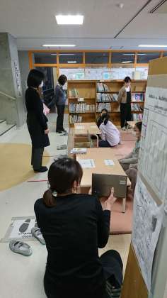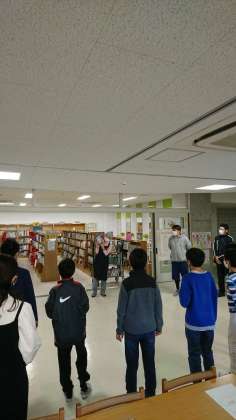 図書委員会は、地下のふれあいスペースと2階の図書室の2ヶ所に分かれて活動していました。きはだ学級の児童は、リモートできはだ学級の教室で参加しています。