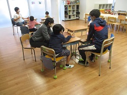 昨日、土曜日に決めた遊びを高学年で話し合い、低学年の子でも楽しめるルールなのか確認したり、道具の準備をしたりしました。