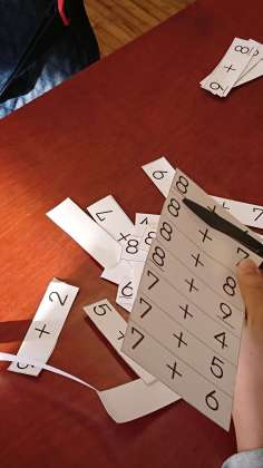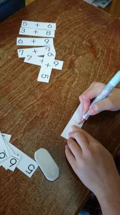 はさみで切って、できたら裏に答えを書き込んでいきます。素早く答えを書き込んでいく子、じっくり考えて書いていく子、まだその様子は様々です。繰り返し行っていく中で、少しずつ速く解けるようになっていくでしょうし、そのための計算カードです。