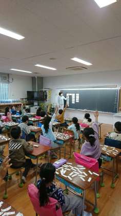 別の学級では、前の時間までに切って完成させていたようで、今日はカードを使った学習をしていました。答えが同じものを並べて、その規則性について考えています。算数の中で感じる数字の規則性やその面白さをたくさん感じて興味をもってほしいです。