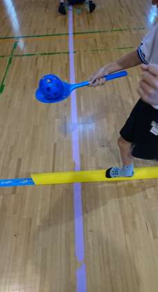 おや?前回すごいスピードでボールを運んでいた子が、慎重にゆっくりゆっくり運んでいます。よく見ると、途中に一本橋があり、そこを一歩ずつ確かめながら進んでいました。難易度アップです。初めはバランスを取るようにゆっくり進んでいましたが、何度かやっているとそれも難なくクリアできるようになっていました。