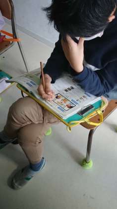今日は、英語でリスニングをしているところでした。英語の説明を聞き取って、説明に合う教科書の絵を線で結んでいきます。