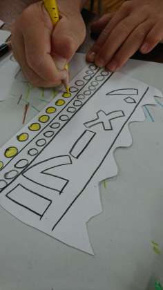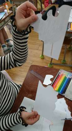 線で切り分けた「形」から連想したものを、色を塗って変身させていきます。同じ形でも、見る子によって何に変身するか変わります。かくれた形から、何かを生み出すようで、想像力が広がります。