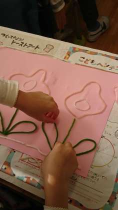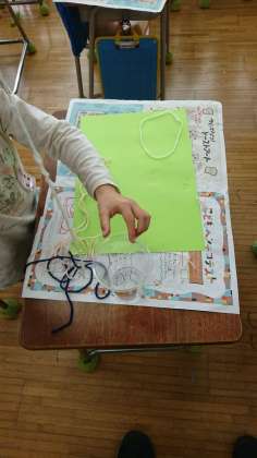 描く絵が決まったら、毛糸をコップに入れた水のりにひたして、描き始めました。お花や動物、きれいな模様を描いている子もいました。土台の紙も明るい色が多く、絵も全体的に明るい感じになっています。