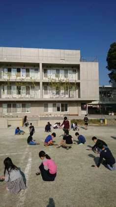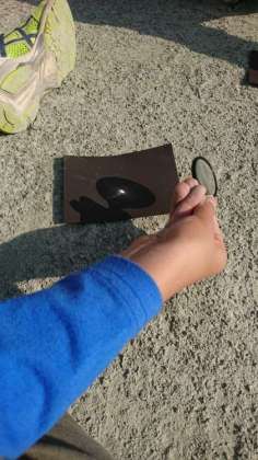 今日は、太陽が燦々と照っていて、実験日和です。初めはなかなか光が集まりません。円にならなかったり、大きな円になったりしてしまいます。いろいろ試しているうちに、うまくいく子が出てきて、何となく全体にもそのコツが伝わっていきます。あちこちで、黒い紙から煙が出始めました。子供たちは、「煙が出た!」と、大興奮!「絶対に触らないように!」先生から再度の注意が入ります。気を付けて!