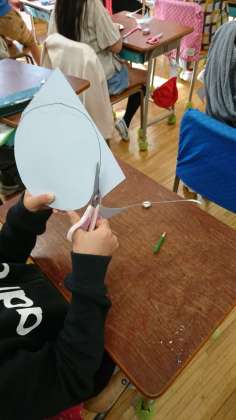 紙の周りを切って、丸い形を切り出し、真ん中にも穴を空けてドーナツの形を作っています。半分に折って切ると、真ん中にきれいな穴が空くことが分かりました。あとは、わり箸とたこ糸を使ってけん玉のようにするようです。