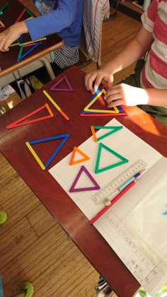 今日は、いろいろな三角形を作って、それを仲間分けしていました。辺の長さや、角に注目して分けていきます。大きさは違っても、同じ三角形の仲間であることもあります。