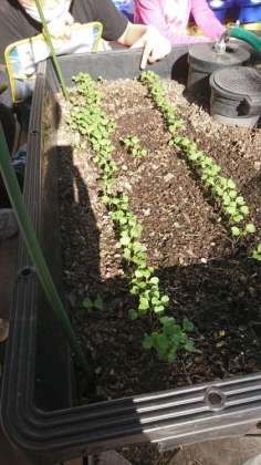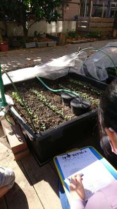 と、ある子が一つの芽を指さして教えてくれました。こんなにたくさん生えているのに、自分が植えた小松菜が分かるとは!思い入れの強さを感じました。