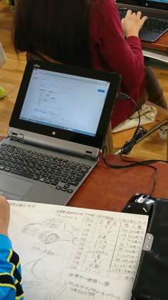 今日は、タブレットを使って、自動車工業について調べていました。メーカーによっては、バーチャル工場見学ができるサイトもあり、実際にそこに行っているような画像が見られました。