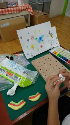 今日は、まず粘土に色を付けていきました。白い粘土に少量の絵の具を包み込むように混ぜて、伸ばして丸めて伸ばして丸めて・・・と繰り返していくと、全体に色がなじんでいきます。様々な色の絵の具を作って、準備完了!いよいよ作品づくりに入っていきました。